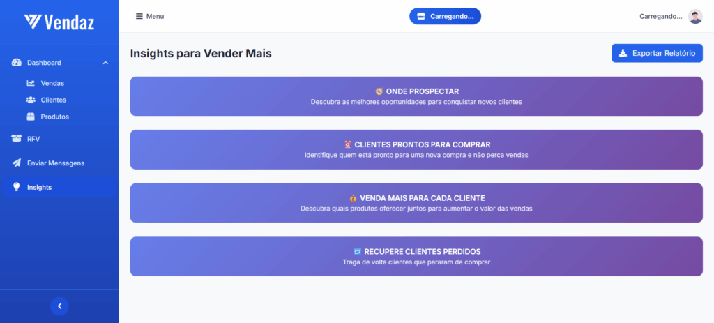 Os algoritmos do Vendaz cruzam o histórico de compras com o estoque atual para gerar recomendações altamente contextuais — como sugerir produtos complementares ou alertar sobre clientes prestes a inativar.